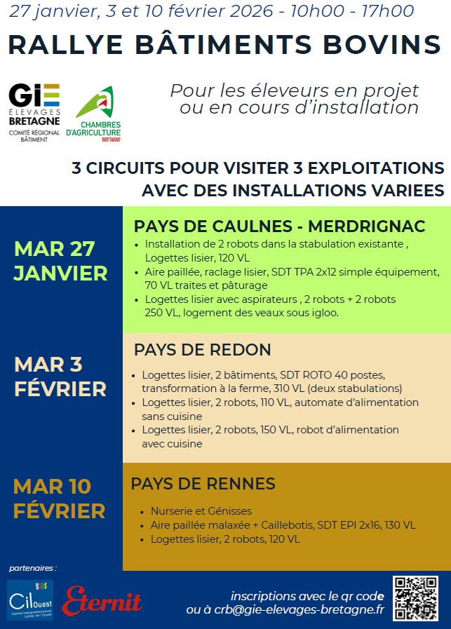 Comme en 2020 et 2023, le Comité Régional Bâtiment organise un rallye de visites de réalisations de stabulations vaches laitières à destination des porteurs de projet en installation ou en projet d´investissement. Une chance pour découvrir des situations diverses et échanger avec les éleveurs sur leur expérience. Ce rallye se fait sur inscription, trois circuits sont proposés, et il est possible d...
