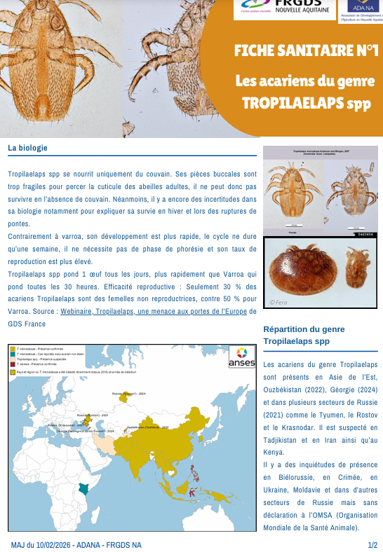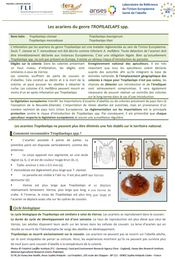Vous trouverez ci-contre une plaquette d´information sur la reconnaissance, le cycle biologique, les conséquences, et ce qu´il faut faire en cas de suspicion d´infestation par Tropilaelaps spp.